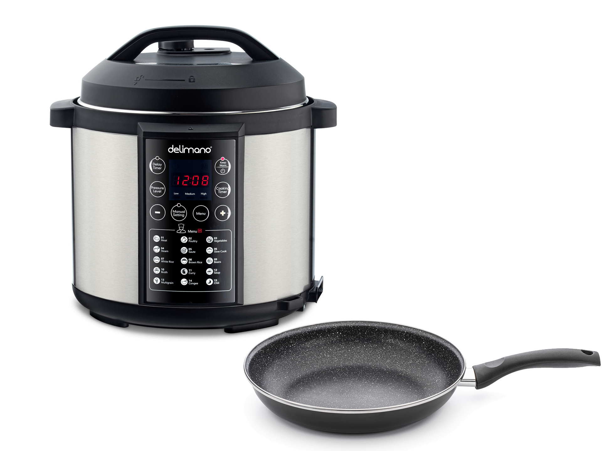 Со Delimano Electric Pressure Мултикукер ќе готвите побрзо, со помала потрошувачка на енергија и повеќе витамини и минерали зачувани во храната. Капацитетот од 5,7л е одличен за големи семејни оброци од месо до супи и чорби. Безвременски спој на форма и функција - Stone Legend Black Тавата за пржење е класичен начин за подготовка и сервирање на оброци за паметење.