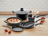 Делимано го претставува Stone Legend Black All-in-One, комплетен сет од 10 дела кој комбинира елегантен дизајн, висок квалитет и максимална функционалност. Со силна основа од јаглероден челик и облога Quantanium® со честички од вистински камен и титаниум, овие садови ја задржуваат топлината и постепено ја дистрибуираат кон храната, задржувајќи ја влагата, витамините и природните ароми.